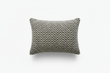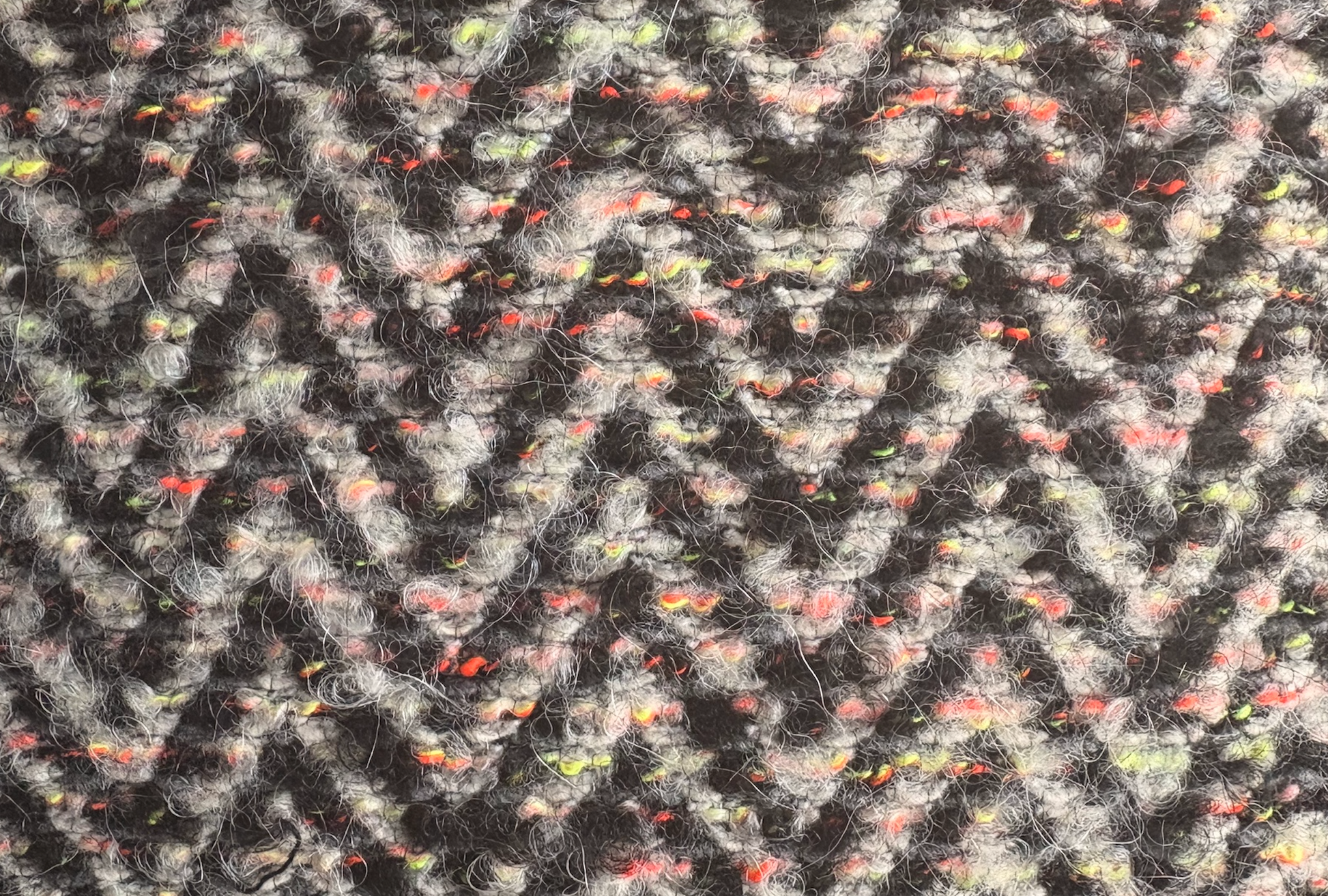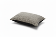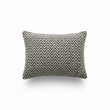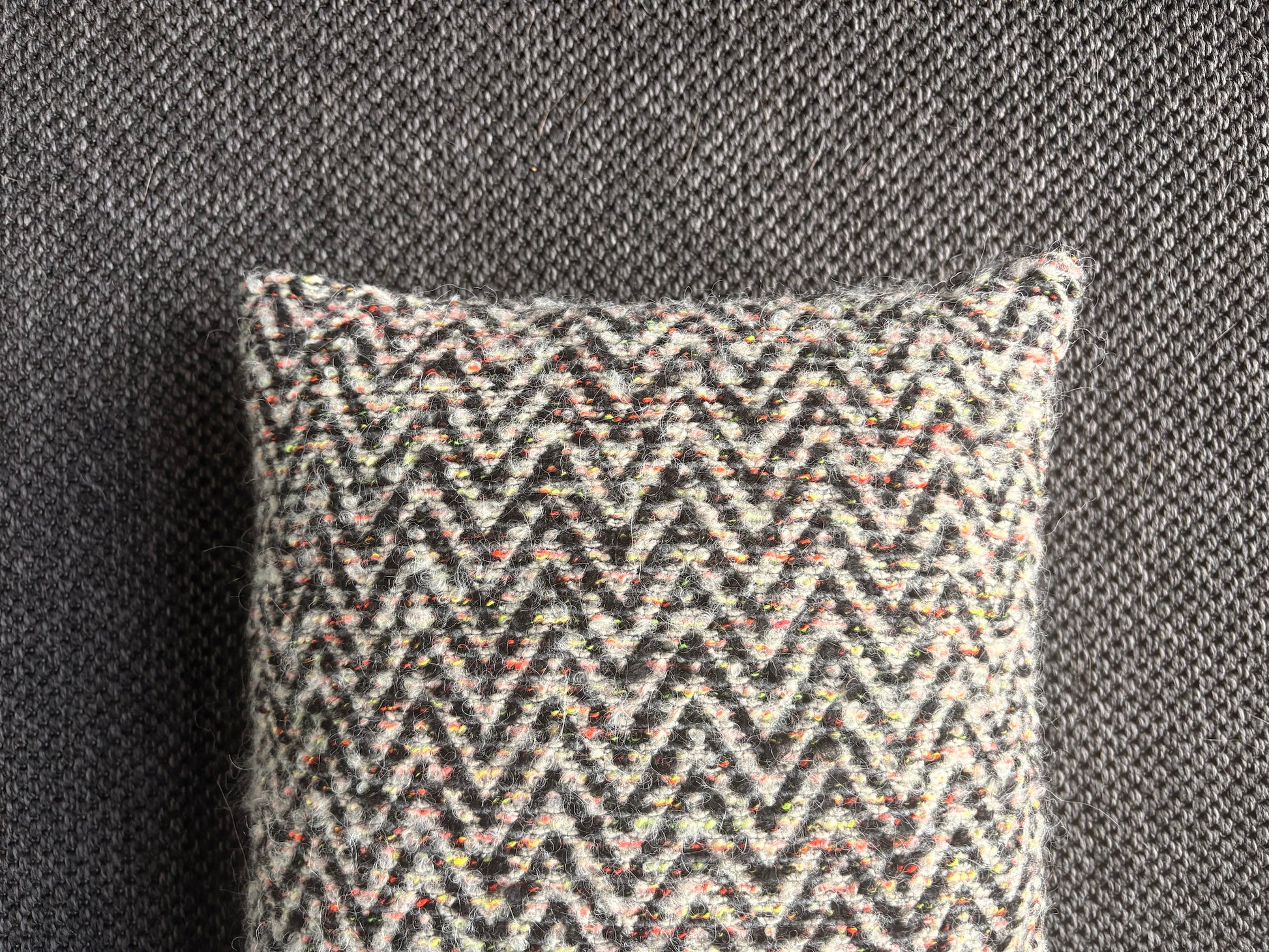 Elegant cushion featuring a sophisticated chevron pattern in natural tones. The textured herringbone weave combines charcoal grey and cream with subtle flecks of color, creating a timeless alpine-inspired aesthetic and a black velvet side. Perfect for adding warmth and refined style to any living space.