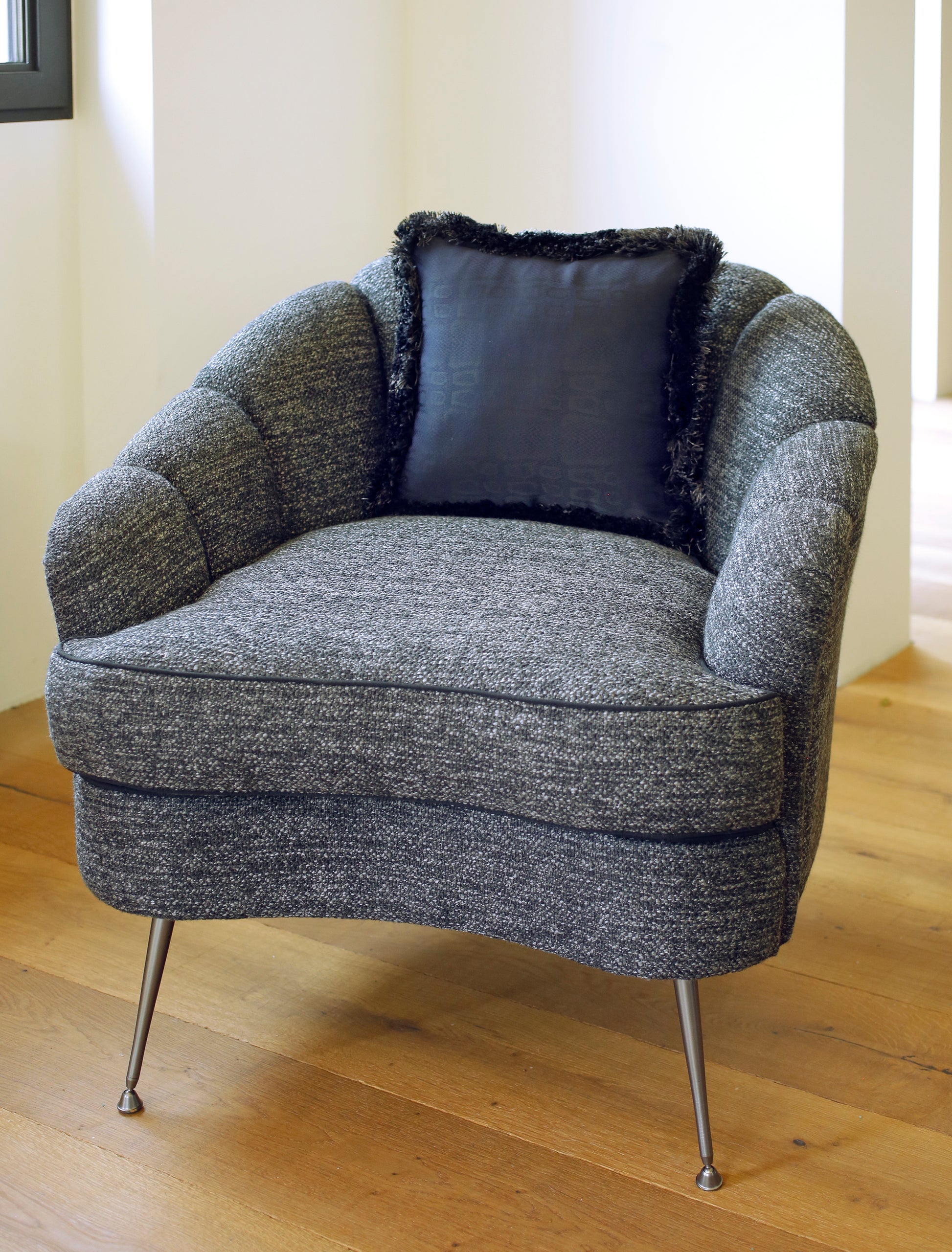 Elegant square cushion from the Nocturne collection, featuring a luxurious silver-violet viscose silk fabric with an artistic distressed ombre effect and snake motif, transitioning from light silver tones to darker violet-blue hues. Finished with decorative light grey fringe trim around all edges. Crafted with high-quality artisanship, this sophisticated cushion adds a touch of contemporary elegance and artistic flair to your living space.